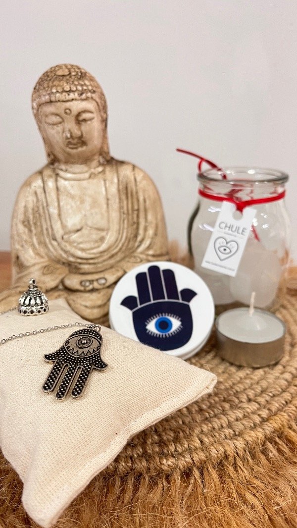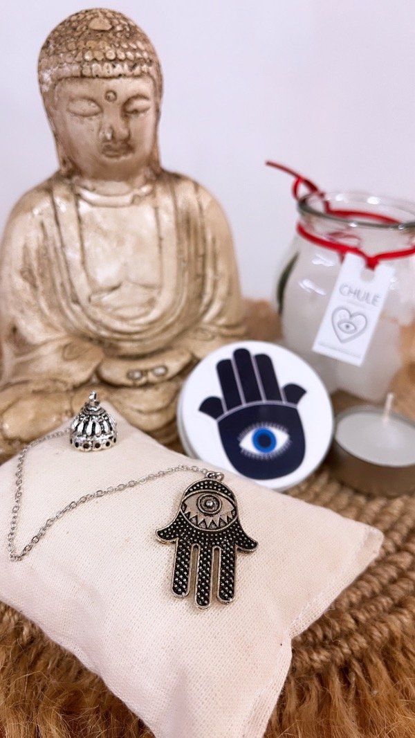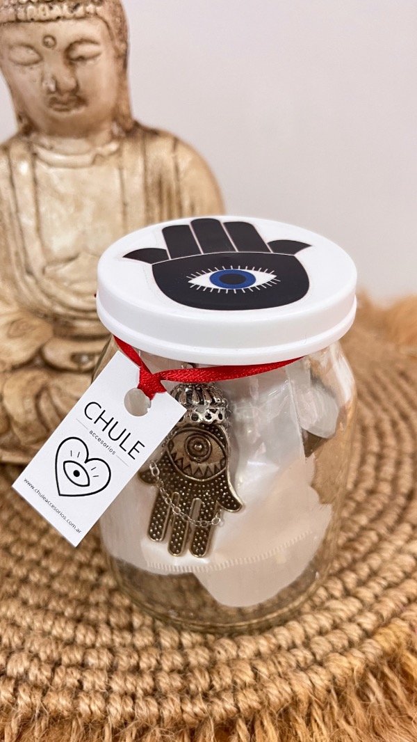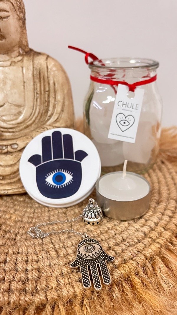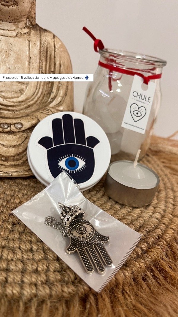 ~ frasco con 5 velitas de noche y apagavelas Hamsa 🪬 quien detiene las miradas mal intencionadas y repele la mala vibra, protegiéndonos de la envidia y el mal de ojo 🧿