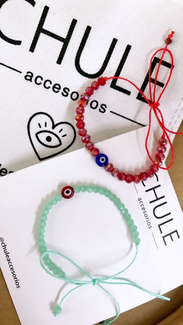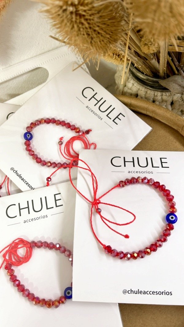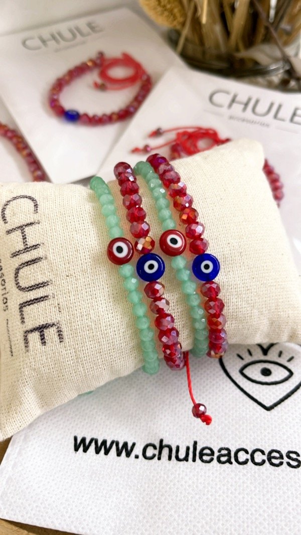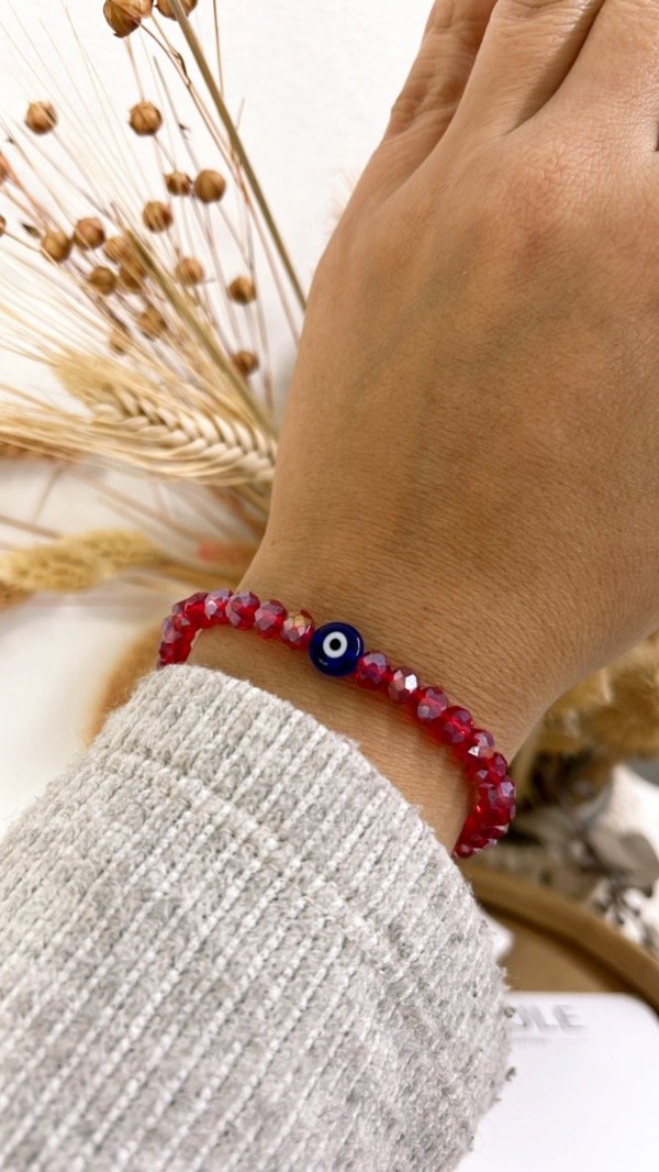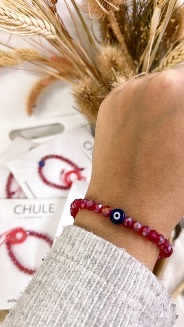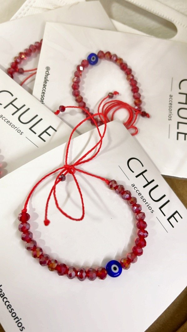 Los cristalitos son rojo granate, con un hermoso brillo nacarado. El ojo turco azul en vidrio, es de nuestra colección de importados :) los trajimos de nuestro último viaje a Chile!