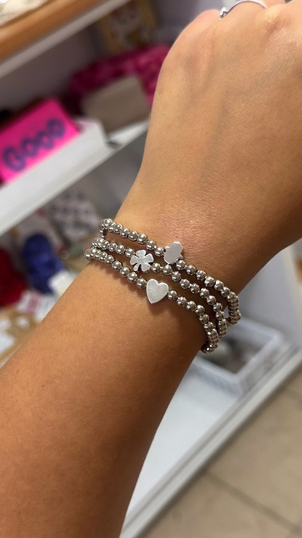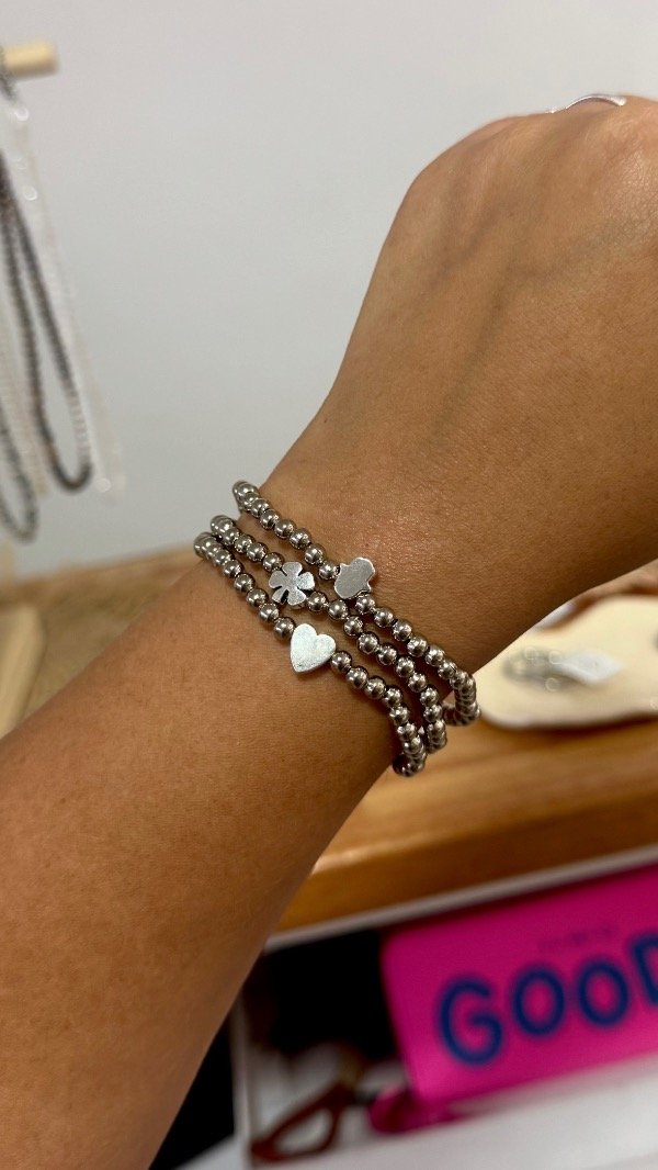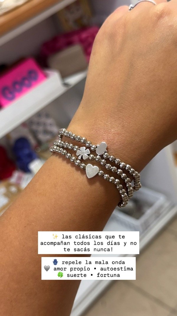 Clásicas de ayer, hoy y siempre ❤️🔥 este trío de pulseras elásticas está elaborado con cuentas y dijes de metal niquelado. La calidad es excelente, podés usarla todos los días y no va a pasar nada :)